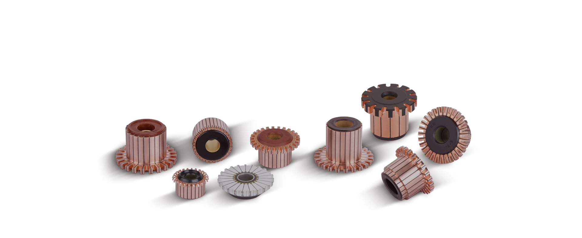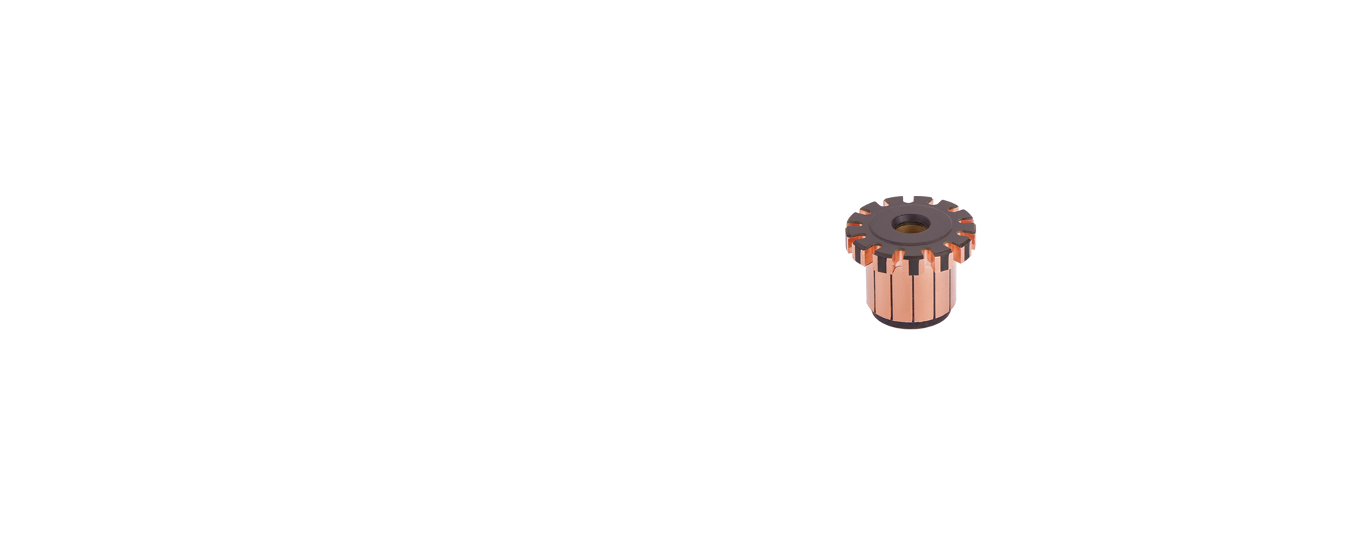 換向器接連接方式分構形和槽形換向器, 構造由內至外由銀銅換向片,云母片,加強環和電木粉...